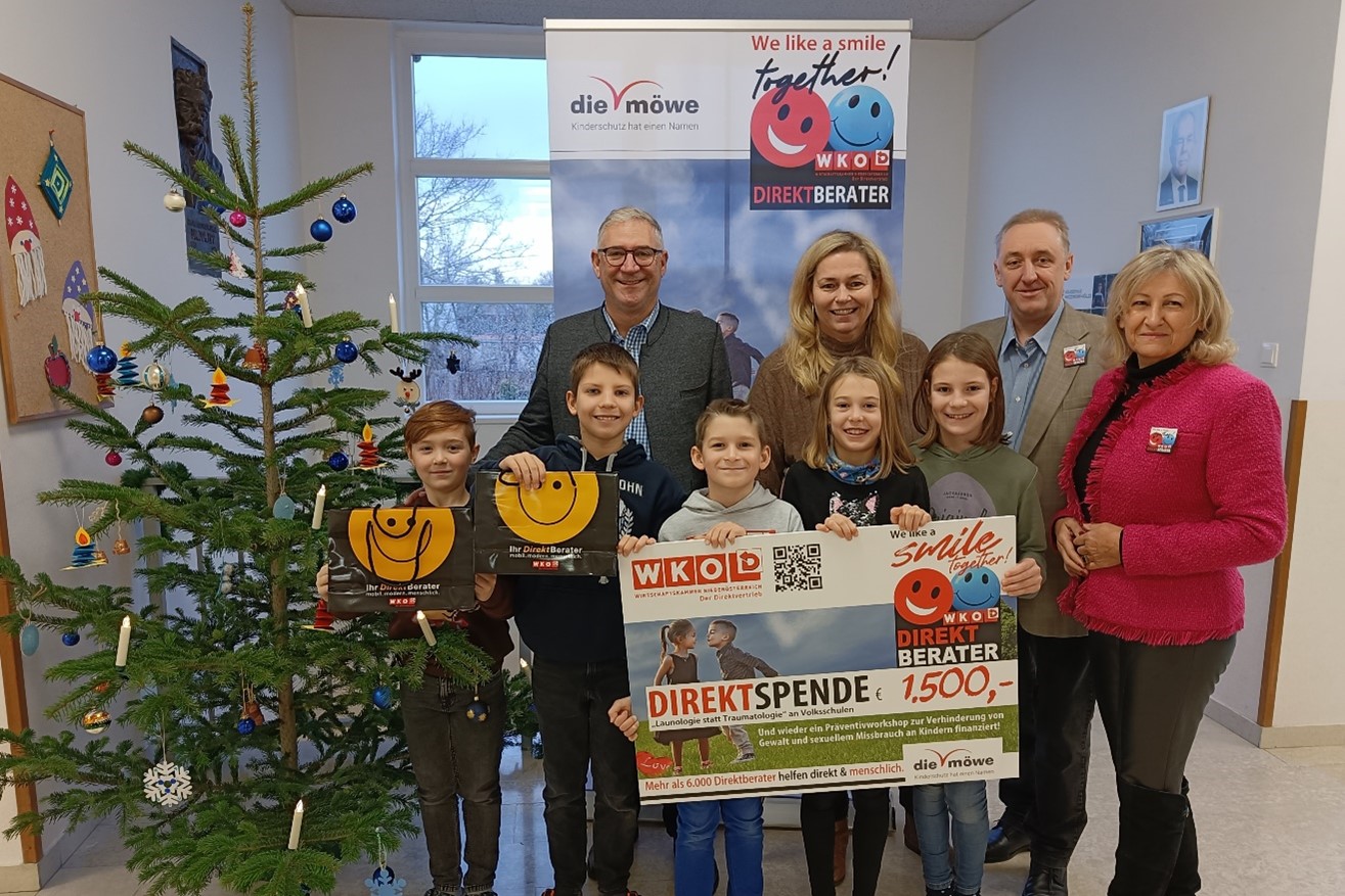 Ein weiteres Mal unterstützen die Direktberater der Wirtschaftskammer NÖ mit einem Spendenscheck die möwe Kinderschutzarbeit. Die Spendensumme von € 1.500,- wurde an die Volksschule Matzendorf-Hölles für ein „Trau Dich“-Präventionsprojekt der möwe überreicht.