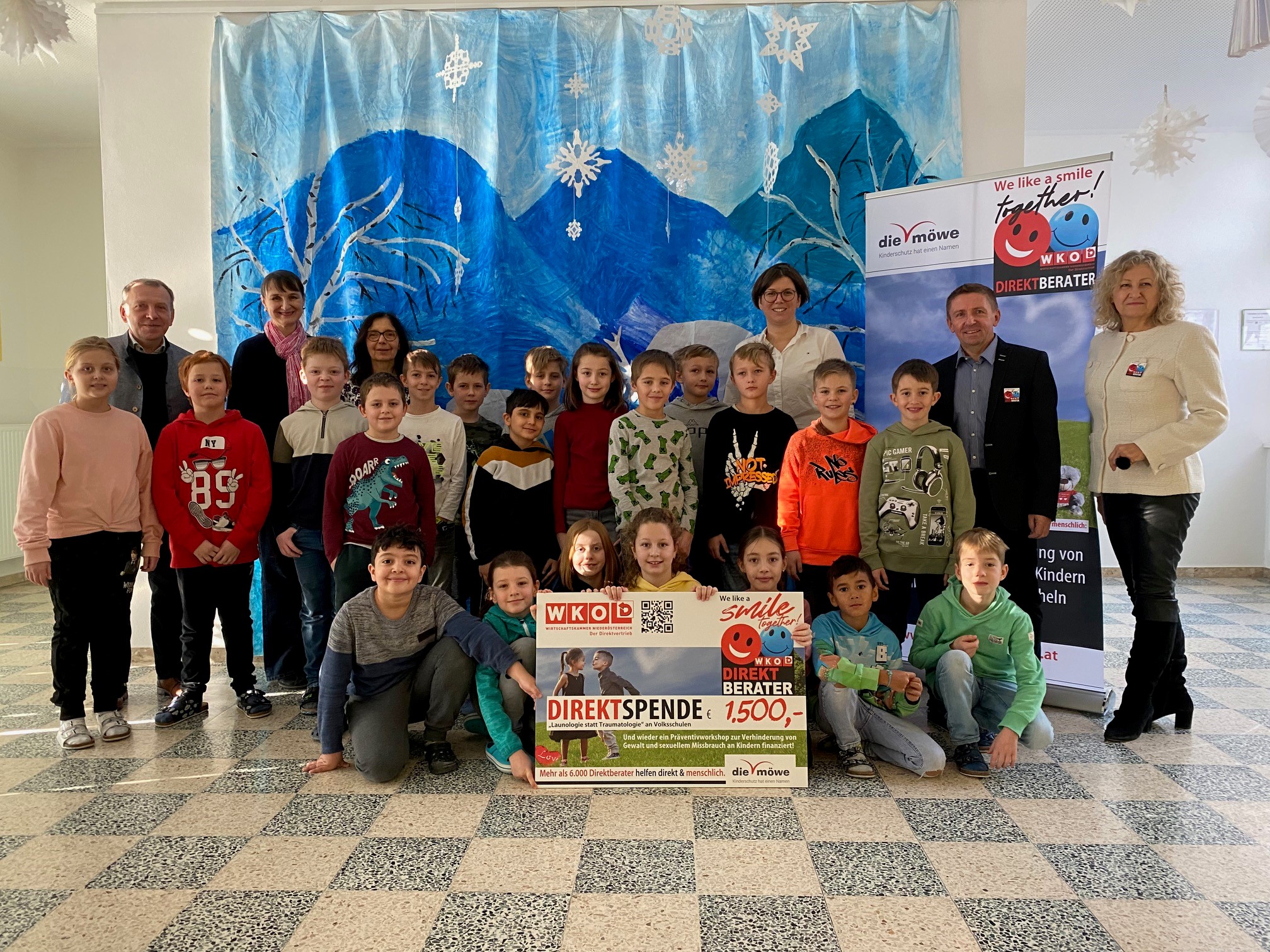 Auf Initiative von Andreas Weinberger, Ausschussmitglied im Gremium Direktvertrieb NÖ, wurde der 60. Spendenscheck in der Höhe von € 1.500,- zur Finanzierung eines möwe-Präventionsworkshops an der VS Waidhofen/Thaya übergeben. Direktorin Manuela Gegenbauer zeigte sich sehr erfreut über diese großartige Unterstützung und verwies auf ihre bereits positiven Erfahrungen in Kooperation mit der möwe. „Gerade jetzt sind die Themen des Workshops sehr wichtig und unterstützen unsere Arbeit sehr positiv“ betonte sie in ihren Dankesworten. Eingefunden zu diesem Termin haben sich auch die Obfrau der Wirtschaftskammer-Bezirksstelle Marlene-Eva Böhm-Lauter und Bürgermeister Josef Ramharter, der die Wichtigkeit dieser Präventionsarbeit betonte und sich bei den Spender*innen für diese tolle Projekt bedankte.