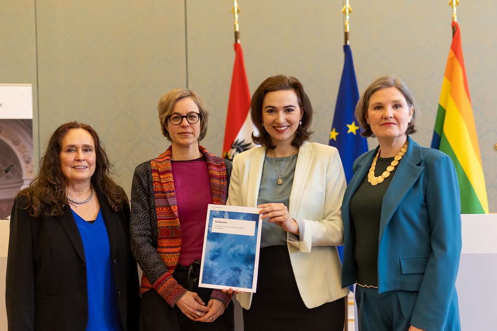V.l.n.r.: Andrea Berger (Wiener Frauenhäuser), Christine Miklau (Familienrichterin), Alma Zadic (Justizministerin), Hedwig Wölfl (Geschäftsführerin und fachliche Leiterin die möwe)