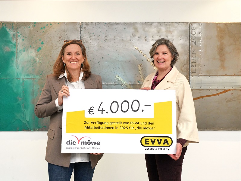 Seit 2009 unterstützt der heimische Hersteller mechatronischer Zutrittssysteme EVVA die Kinderschutzarbeit der möwe. Heuer wurde erneut ein Spendenscheck in der Höhe von 4.000 Euro überreicht. Die Summe ergibt sich durch Spenden der Mitarbeiter*innen, Beiträge der Geschäftsleitung sowie Erlöse aus internen Charity‑Aktivitäten wie der EVVA‑Charity‑Bar auf der EVVA-Weihnachtsfeier. Durch die langjährige Kooperation unterstützt EVVA kontinuierlich die Bereitstellung von therapeutischer Hilfe, Beratung und Präventionsarbeit für Kinder und Jugendliche, die von Gewalt betroffen sind.