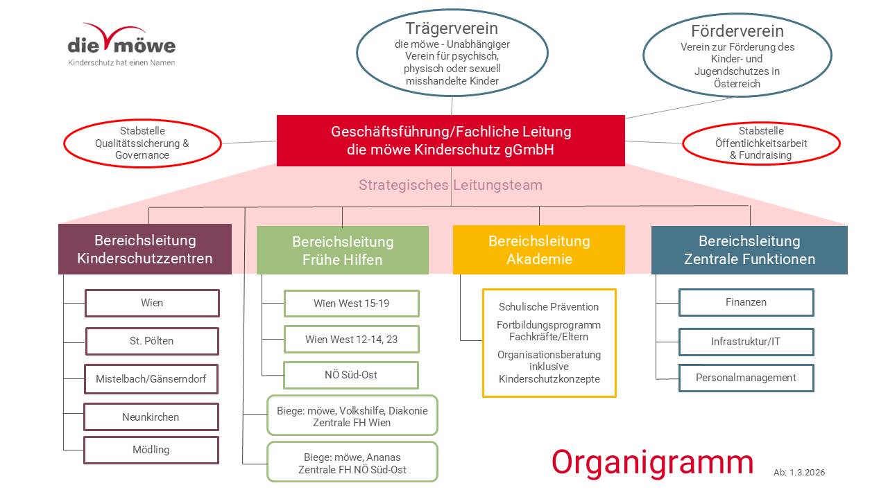 die möwe ist eine der größten Kinderschutzorganisationen Österreichs. Alle Fachpersonen verfügen über psychosoziale Grundberufe und viele Zusatzqualifikationen und arbeiten direkt mit den Betroffenen. Sie werden von einem Administrationsteam in vielfältiger Weise unterstützt.